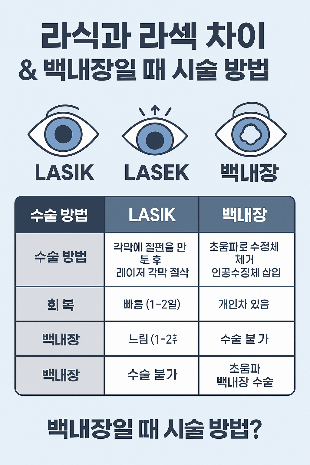 - 라식·라섹은 각막 교정술, 백내장은 수정체 질환 → 수술 방식 완전 다름