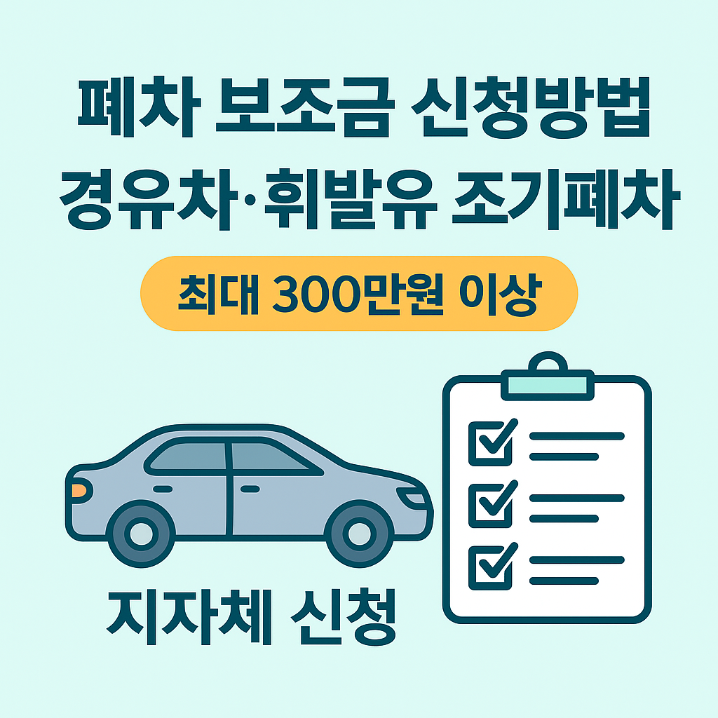 폐차 보조금은 미세먼지 저감과 친환경차 보급을 위해 정부·지자체가 지원하는 제도로, 경유차와 일부 휘발유 차량 조기폐차 시 신청 가능하다. 신청은 환경부 무공해차 보급사업 사이트 또는 지자체 환경과에서 진행하며, 보조금은 차종·연식·배출가스 등급에 따라 최대 300만 원 이상 지원된다.